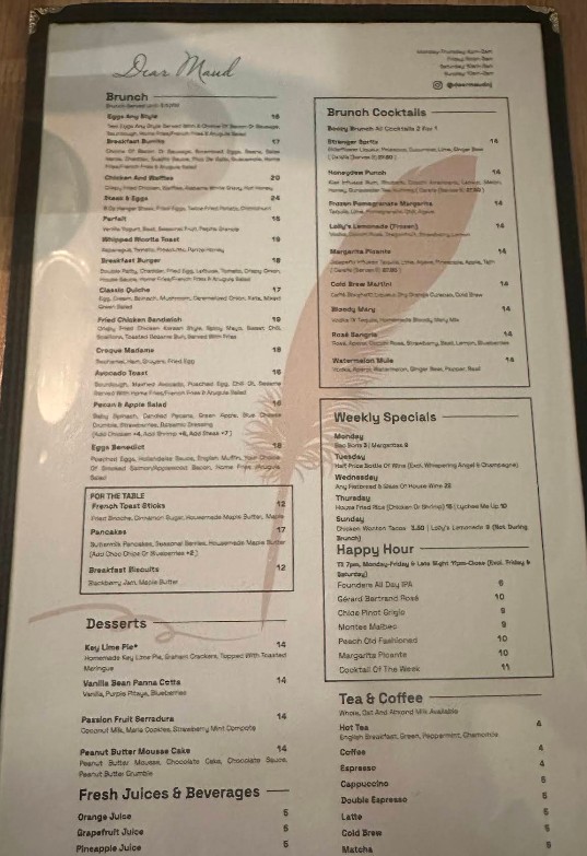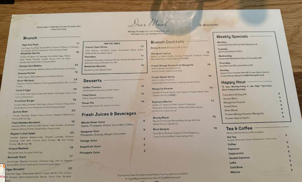 Dear Maud is open on Monday, Tuesday, Wednesday and Thursday from 12:00 PM - 2:00 AM; Friday from 12:00 PM - 3:00 AM; Saturday from 10:00 AM - 3:00 AM; Sunday from 10:00 AM - 2:00 AM.