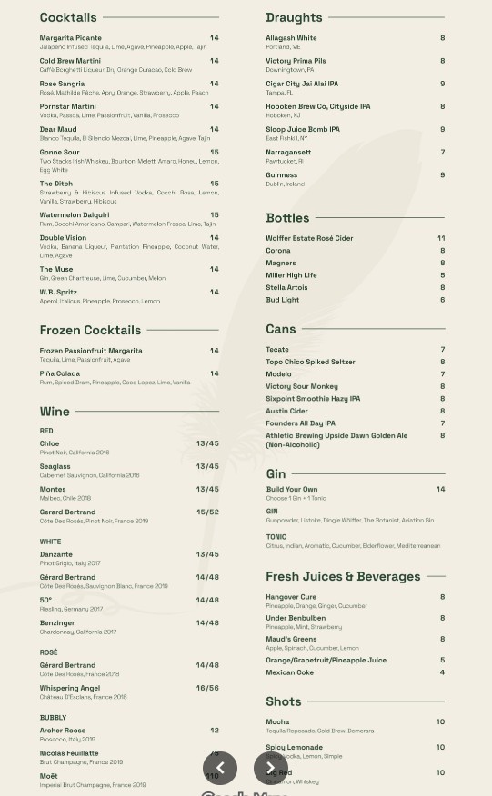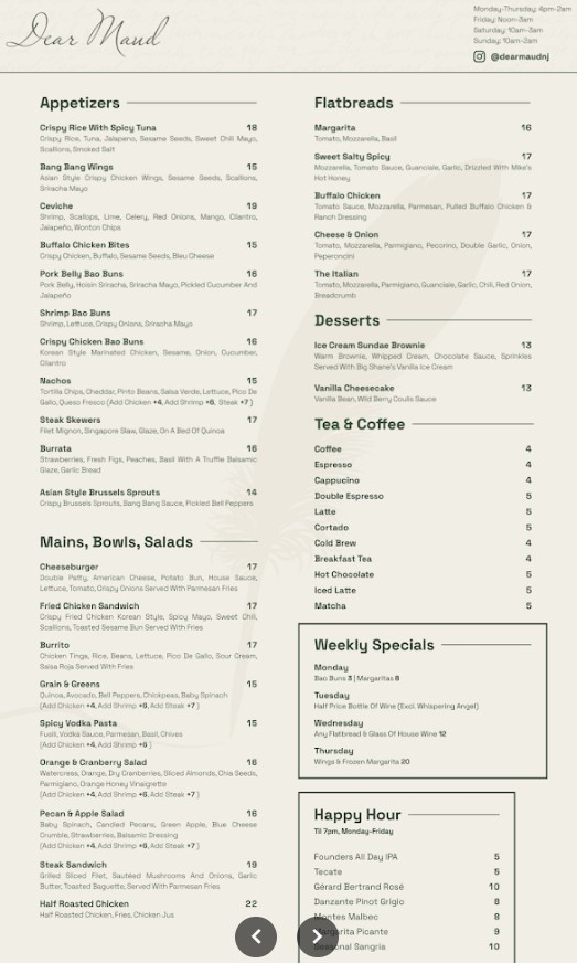 Dear Maud Restaurant is a modern cocktail bar and dining destination in the heart of Hoboken, New Jersey. Known for its expertly crafted cocktails, thoughtfully curated menu, and intimate atmosphere, Dear Maud Restaurant offers the perfect setting for date nights, casual evenings, and late-night gatherings. With attentive service, quality ingredients, and a welcoming vibe, every visit delivers a refined yet relaxed experience worth returning for.