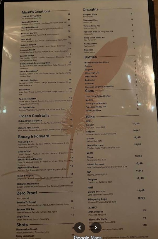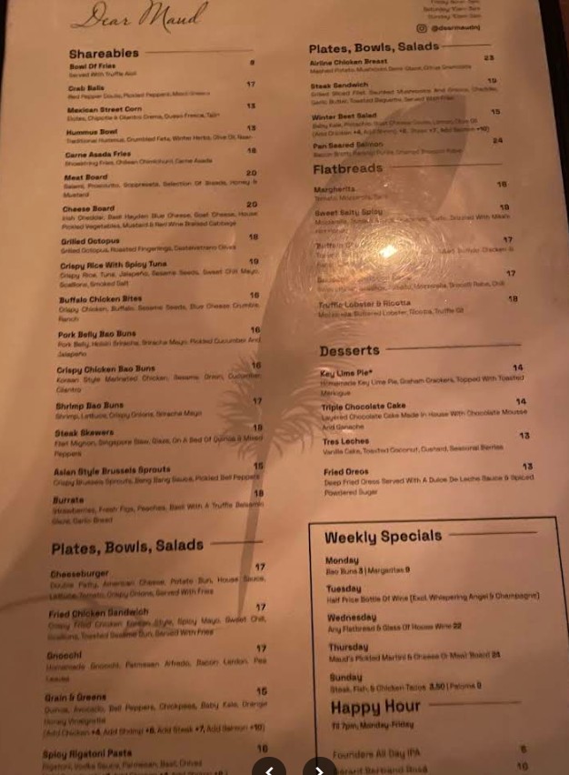 The food was extremely small portioned and overly seasoned. The selections were odd considering the Irish heritage and background of “Dear Maud”. The servers and staff were all extremely kind. But would I return? Nah. 6 tiny overcooked shrimp or 10’tiny over cooked chicken bites for a 20$ dish. Or the overly seasoned fries. Could get the same quanlity with better portions at an in and out for less money. Def aiming toward the younger hip crowd of Hoboken but falls shorts of the quality per price when so many amazing Irish and American fusion restaurants in the area.